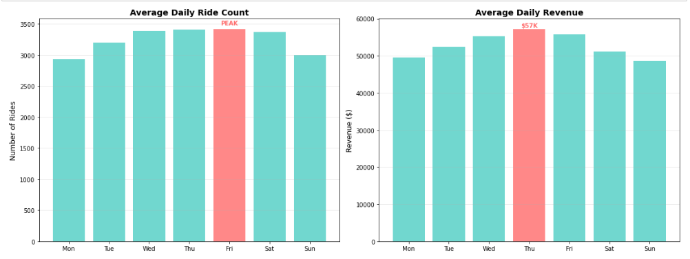 Temporal patterns: July-August show ride dips; Thursday has highest revenue