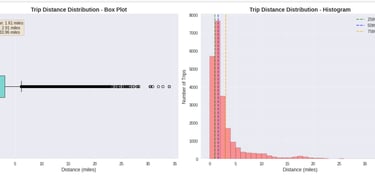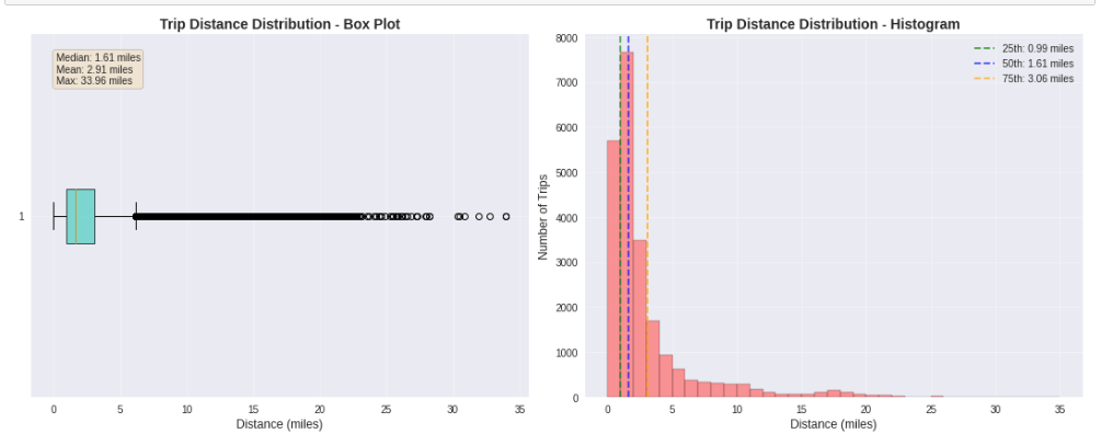 Trip distance distribution: Majority under 5 miles, right-skewed with outliers to 34 miles