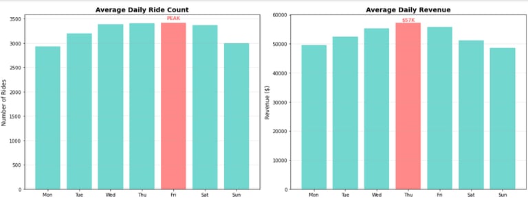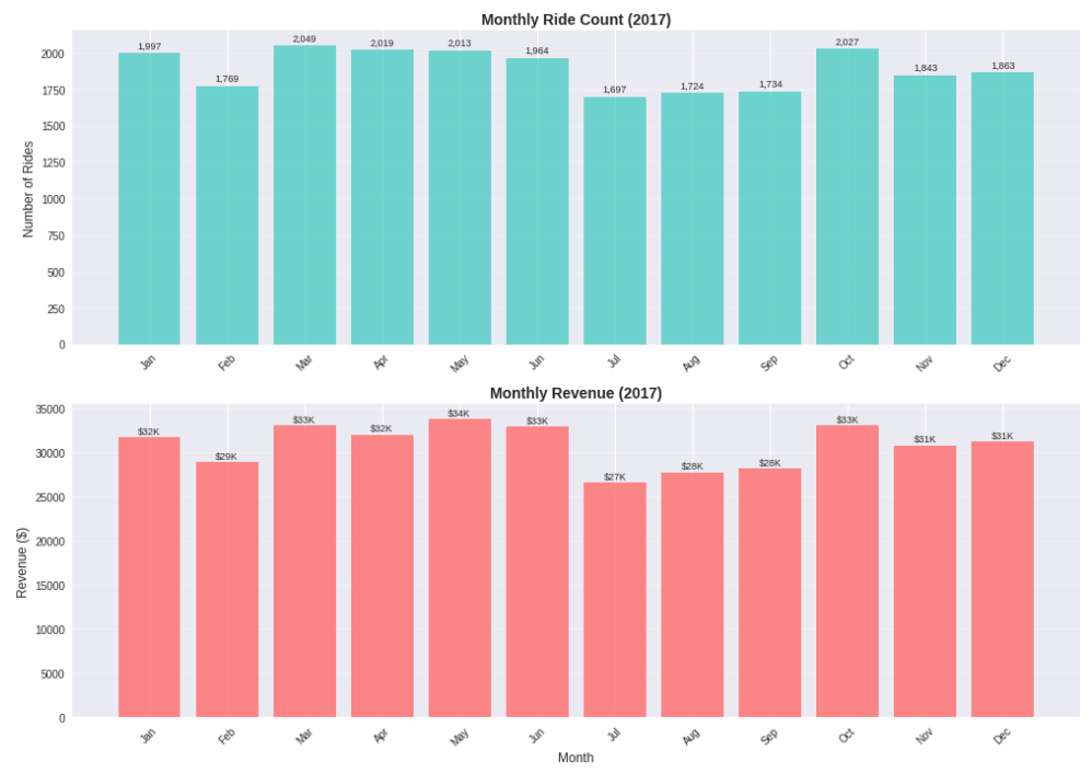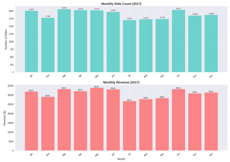 Temporal analysis: Monthly and daily patterns in ride volume and revenue