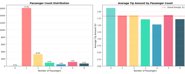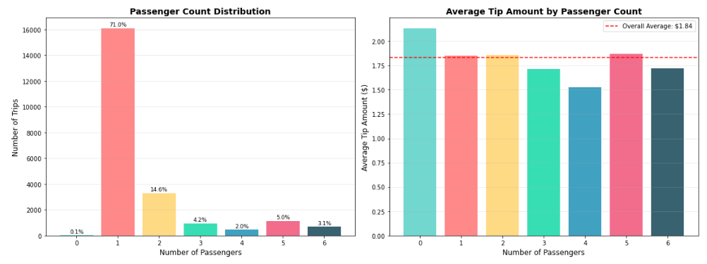 Passenger behavior: Single passengers dominate (71% of trips), but don't tip significantly more