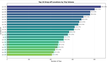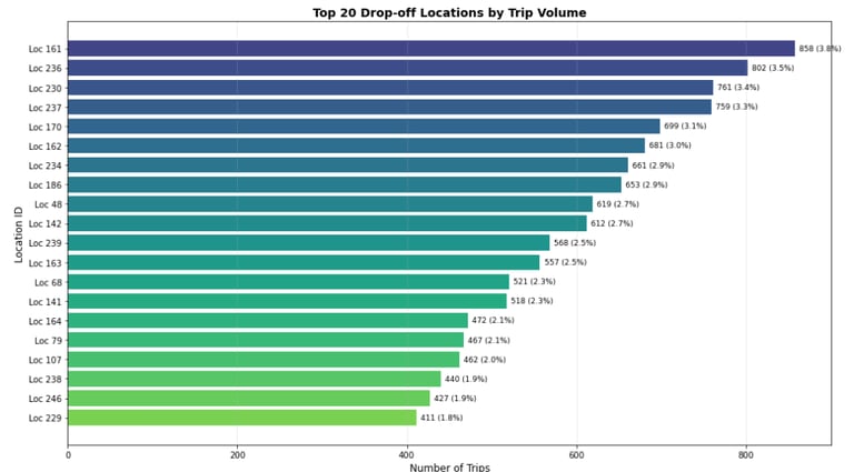 Geographic distribution: Drop-off locations are evenly distributed, but traffic concentrates at popular locations